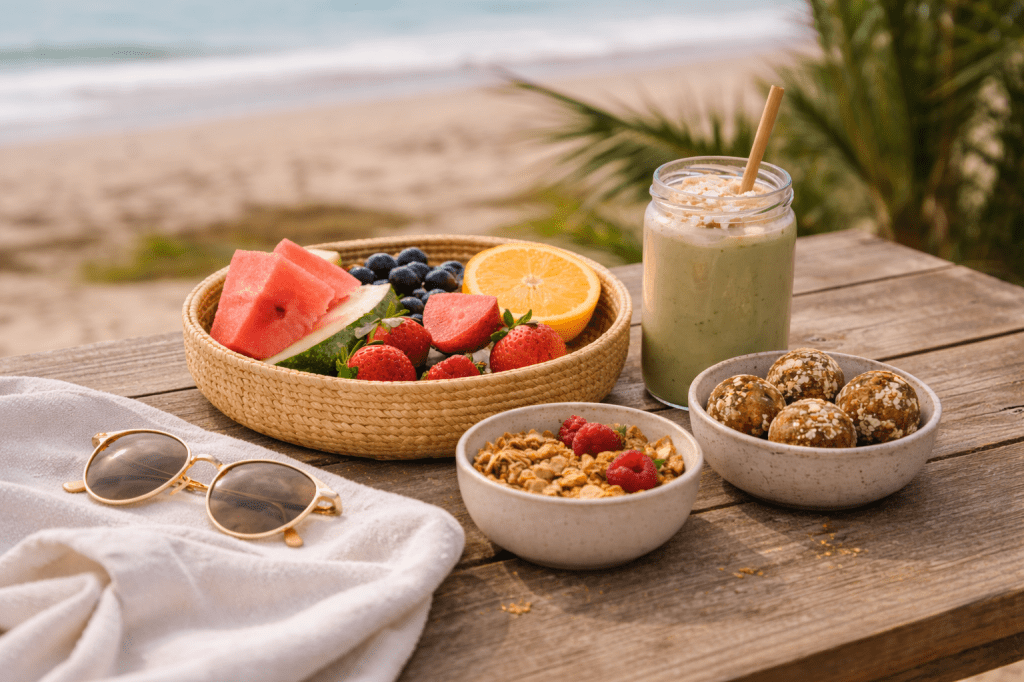 Healthy beach snacks might include fresh fruits, nuts, homemade energy bars or yogurt with granola.